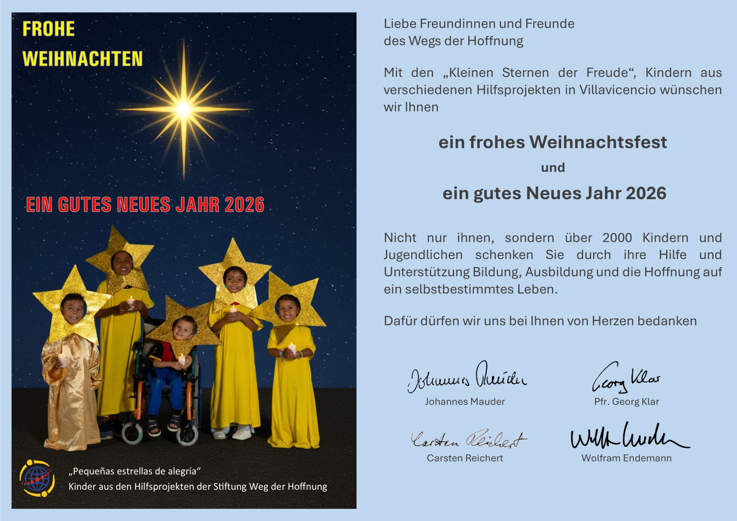 In diesem Sinne engagiert sich die Stiftung Weg der Hoffnung: Wir sind gemeinsam unterwegs in unserer EINEN WELT, um den Ärmsten, vor allem Kindern aus den Elendsvierteln um die Stadt Villavicencio in Kolumbien eine menschenwürdige Zukunft zu ermöglichen.